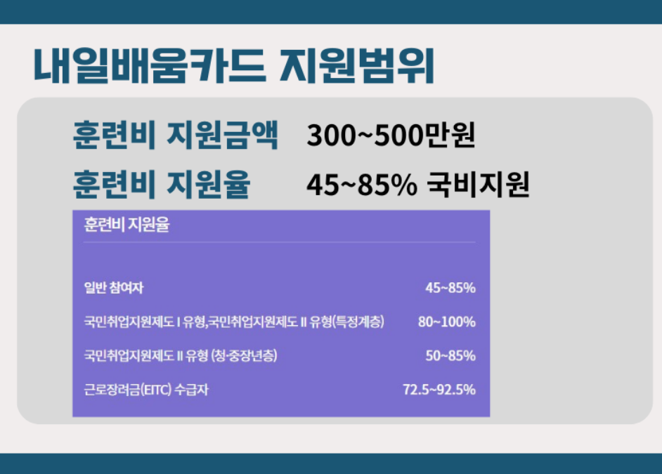 내일배움카드 지원 내용은 최대 5년간 300~500만 원의 교육/훈련비용 지원, 온라인 및 오프라인 교육과정 수강 가능, 고용노동센터 방문 또는 온라인으로 신청 가능 등입니다.