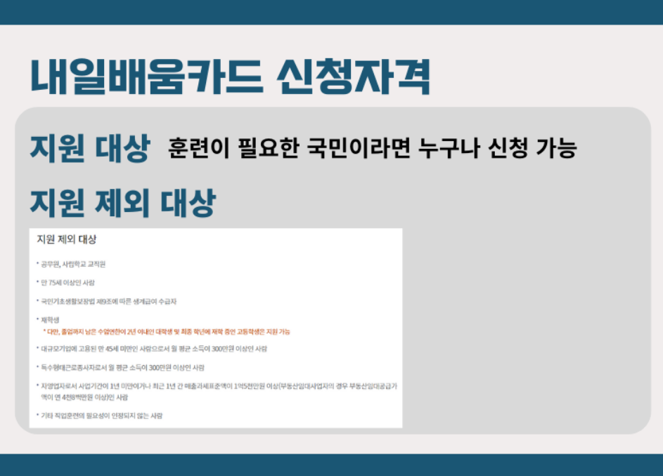 한편, 고등학생(졸업예정자 제외), 연 매출 1억 5천만 원 이상의 자영업자, 월 임금 300만 원 이상인 직장인은 내일배움카드 신청 대상에서 제외됩니다.